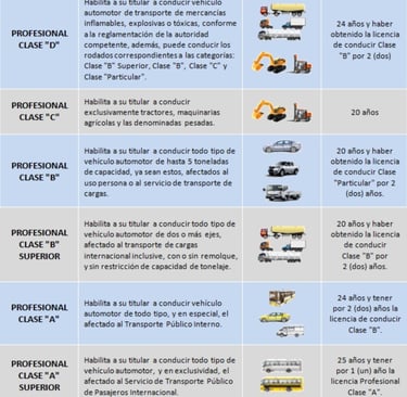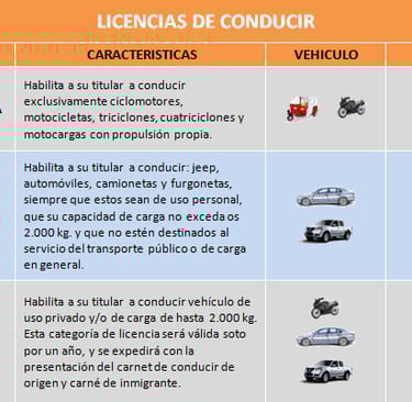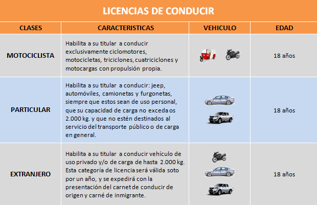 Existen varias categorías de Licencia que autoriza al conductor conducir determinados vehículos. No se puede manejar un auto con licencia de moto ¡Es lógico verdad! Así tampoco está permitido utilizar un vehículo destinado al transporte de carga o pasajero con la categoría Particular. Te indicamos las categorías y son: